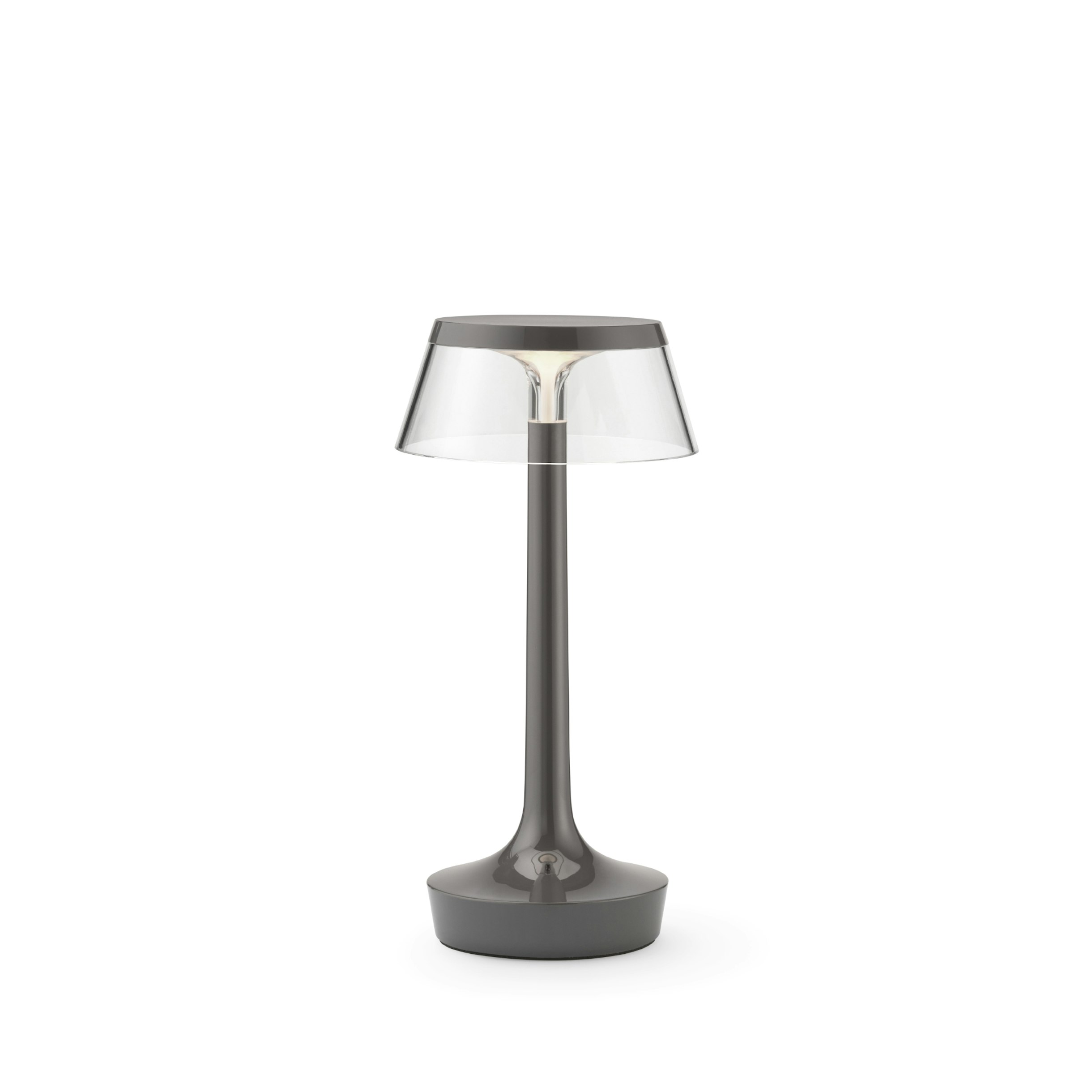 Kabellose Tischlampe mit direkter Beleuchtung. Gehäuse aus spritzgegossenem Material und transparenter PMMA-Diffusor. Lichtquelle mit Edge Lighting-Technologie. Akkulaufzeit von 6/24 Stunden, wiederaufladbar über USB C und Qi. Optischer Sensorschalter an der Basis mit 4-stufiger Dimmfunktion und 3-stufiger Farbtemperaturregelung (2200K, 2700K und 3000K). USB-C-Ladekabel mit einer praktischen Länge von 120 cm im Lieferumfang enthalten.