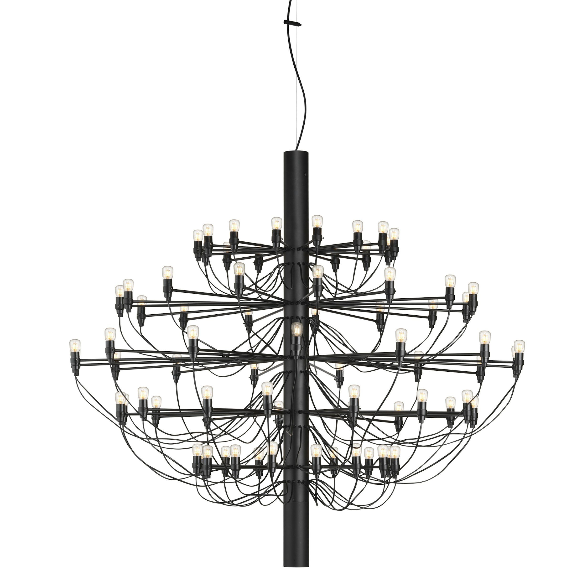 Since 1958, this iconic Gino Sarfatti design has served as an ultra-modern representation of the traditional mid-century chandelier. Every detail of this state-of-the-art ceiling light is exceptional, from the mirror-polish finish of its main steel structure to the way each bulb is fitted with its own horizontal arm and the graceful wiring meandering down the stem. The 2097 collection is available in incandescent and LED versions and in brass, chrome, and new matte black finishes. Available in three models: 2097/18 2097/30 2097/50. Behind the Design: Renewed for his contribution to the modern architectural movement in lighting, creator Gino Sarfatti designed the 2097 Chandelier in accordance with his legendary utilitarianism and overall desire to create humble yet powerful pieces. Bulbs Included.