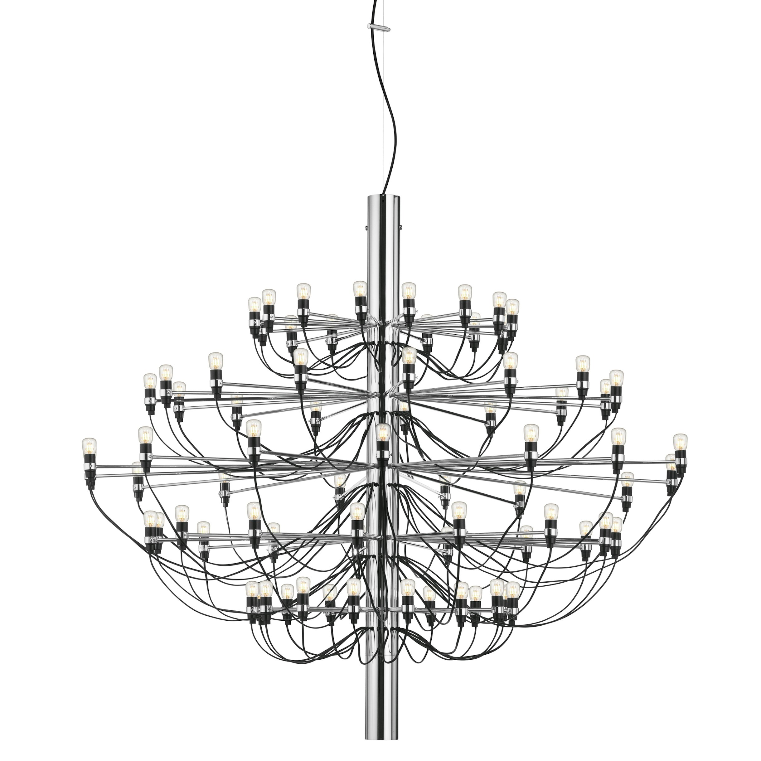 Since 1958, this iconic Gino Sarfatti design has served as an ultra-modern representation of the traditional mid-century chandelier. Every detail of this state-of-the-art ceiling light is exceptional, from the mirror-polish finish of its main steel structure to the way each bulb is fitted with its own horizontal arm and the graceful wiring meandering down the stem. The 2097 collection is available in incandescent and LED versions and in brass, chrome, and new matte black finishes. Available in three models: 2097/18 2097/30 2097/50. Behind the Design: Renewed for his contribution to the modern architectural movement in lighting, creator Gino Sarfatti designed the 2097 Chandelier in accordance with his legendary utilitarianism and overall desire to create humble yet powerful pieces. Bulbs Included.