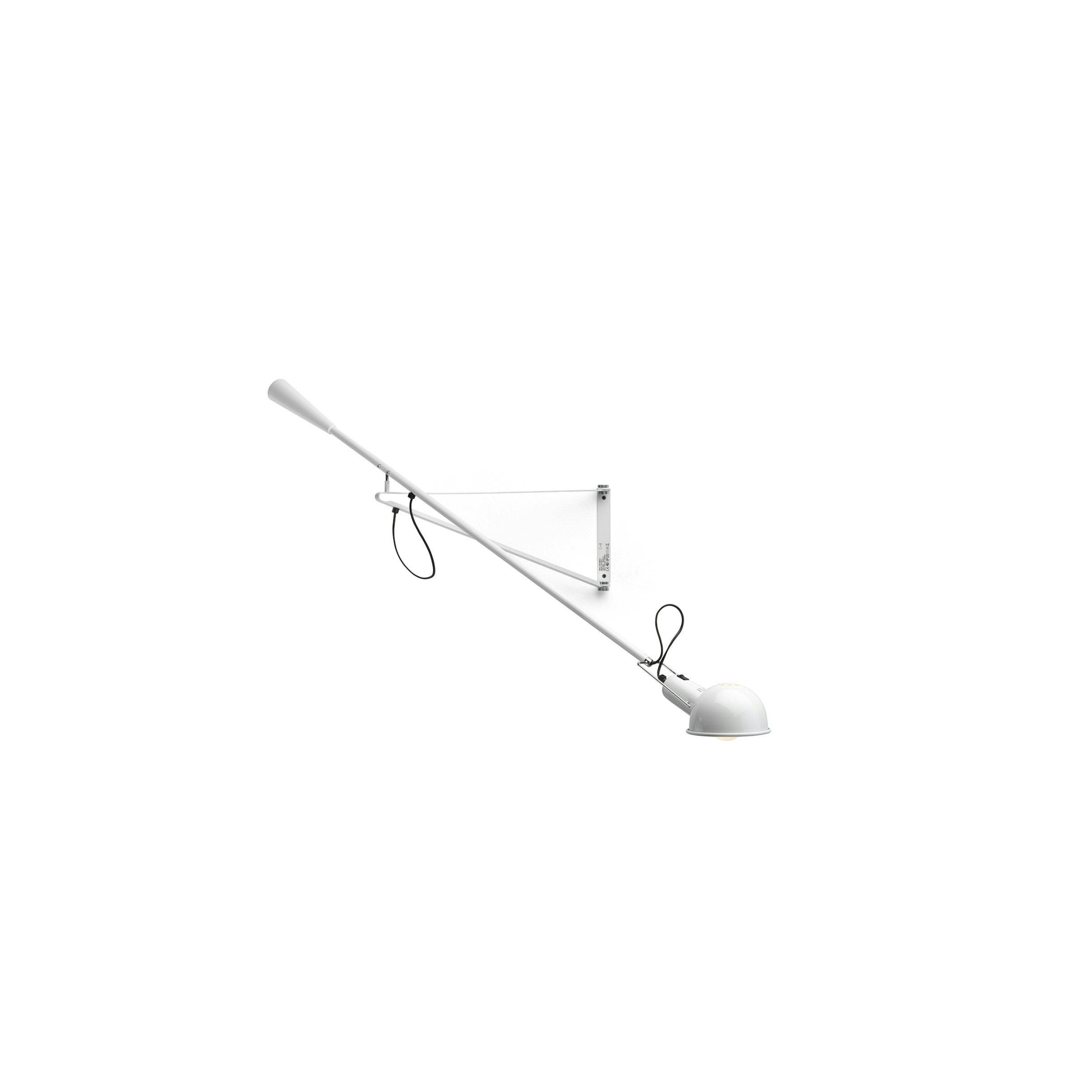 Seeming to defy gravity, the Mod 265 wall lamp by designer Paolo Rizzatto is in a category all its own. Multi-angle rotatable head and long, adjustable swing arm wall lamp.The lamp head-which rotates 360-degrees so that it can be aimed in any direction-provides a clean, direct light. The body is painted steel, with an adjustable arm and reflector. There is a chrome-plated brass reflector support. The counterweight is tapered cast iron. There is an on/off switch on the socket holder, and a plug in power cord measuring 80-inches. Available in black and white finish. Perfect for illuminating a dining table or the bedside. Inspired by a minimalist design, Paolo Rizzatto created this timeless piece in 1973.
