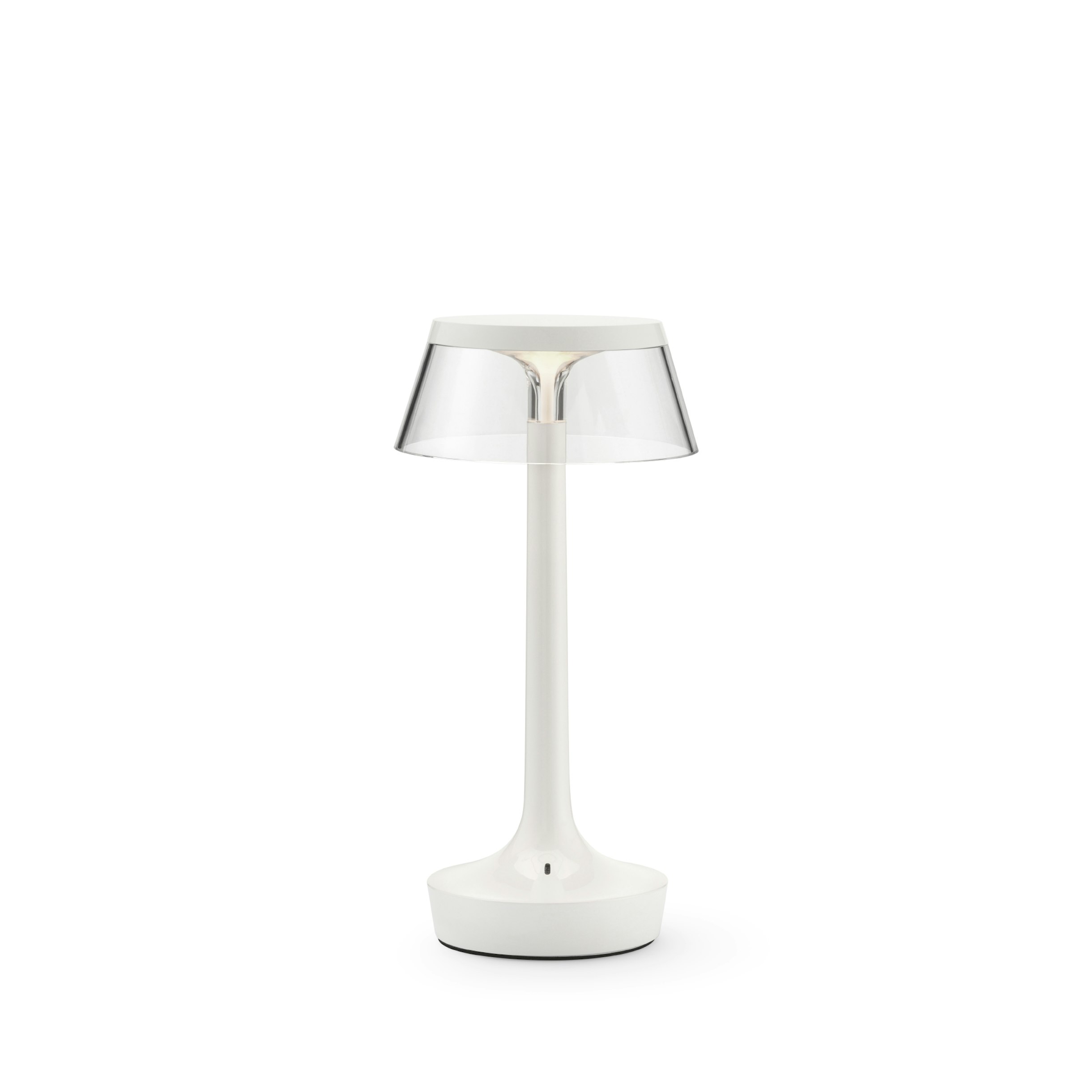 Cordless table lamp providing direct light. Injection moulded body and PMMA clear transparent diffuser. Edge Lighting technology light source. 6/24 hours battery life, rechargeable with USB C and Qi. Optical switch sensor on the base that provide 4-step dimming function and Color temperature control on 3-steps (2200K, 2700K and 3000K). USB-C charger cable included in the package useful length 120 cm