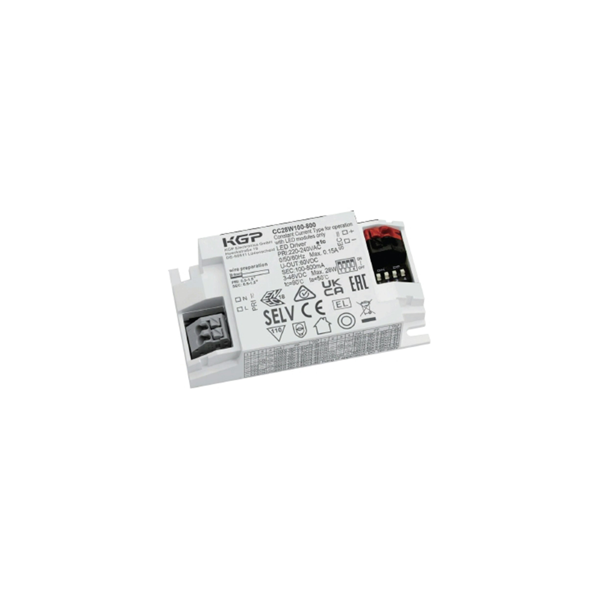 Constant current power supply 28W, 220-240V - 50/60Hz with programmable output current via DIP switch. 100mA - 5.4W / 150mA - 7.9W / 200mA - 10.4W / 250mA - 13W / 300mA - 15.5W / 350mA - 18W / 400mA - 20.4W / 450mA - 23W / 500mA - 25.8W / 550mA - 28.4W / 600mA - 31W / 650mA - 31.4W / 700mA - 31.8W / 750mA - 31.5W / 800mA - 31.8W. Non-dimmable.